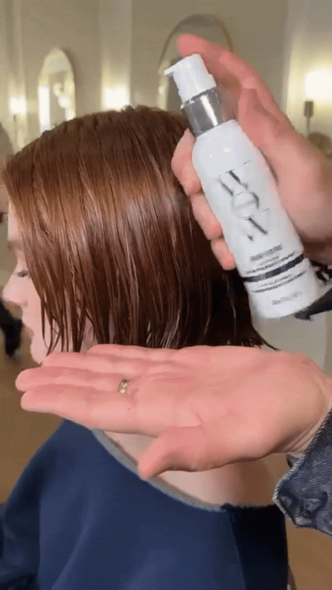 2. Shake bottle well, then dispense two to three pumps into palm and smooth through hair, starting one inch below part and through to ends. Apply more as needed